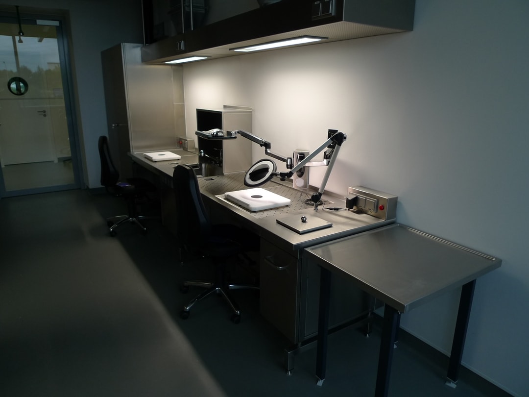 In Anatomie- und Pathologiebereichen geht die eigentliche Gefahr für den Untersuchenden nicht von den „gehandhabten Arbeitsstoffen“ aus. Bei unbekanntem Infektionsstatus muss zwar auch große Vorsicht an den Tag gelegt werden, was aber mit leichter PSA (Mundschutz, Handschuhe) erreicht werden kann. Die größere Gefahr für Menschen, die täglich in derartigen Bereichen arbeiten, geht jedoch von einem Hilfsstoff aus, dem Formalin. Zum Schutz vor Formalin werden Autopsietische und Zuschneidetische in der Pathologie stets nach unten abgesaugt und mit einem Laminar-Flow Modul oberhalb des Tisches ausgestattet.