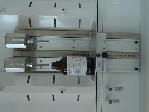 Unter dem Laborabzug wird der Raum genutzt, um Gefahrstoffsicherheitsschränke für die Entsorgung von Lösungsmitteln über Sicherheitstrichter bereit zu stellen. Vergleichbare Konstellationen werden bei Bedarf für die Ver- und Entsorgung von Säuren und Laugen installiert. Die Füllstandsüberwachung erfolgt je nach Wunsch kontinuierlich mittels Schwimmer, berührungslos über kapazitive Messung oder Scheibensensor. Auch Abfalllösungsmittel von Gerätearbeitsplätzen z.B. bei HPLC-Anlagen werden automatisch in Sicherheitsschränken mit Sammelleitungen für Kapillaranschlüsse aufgefangen. Hierzu dienen Ein- oder Mehrwegkanister oder feste Sammelbehälter mit Anschlüssen für Entsorgungs-Wägen.